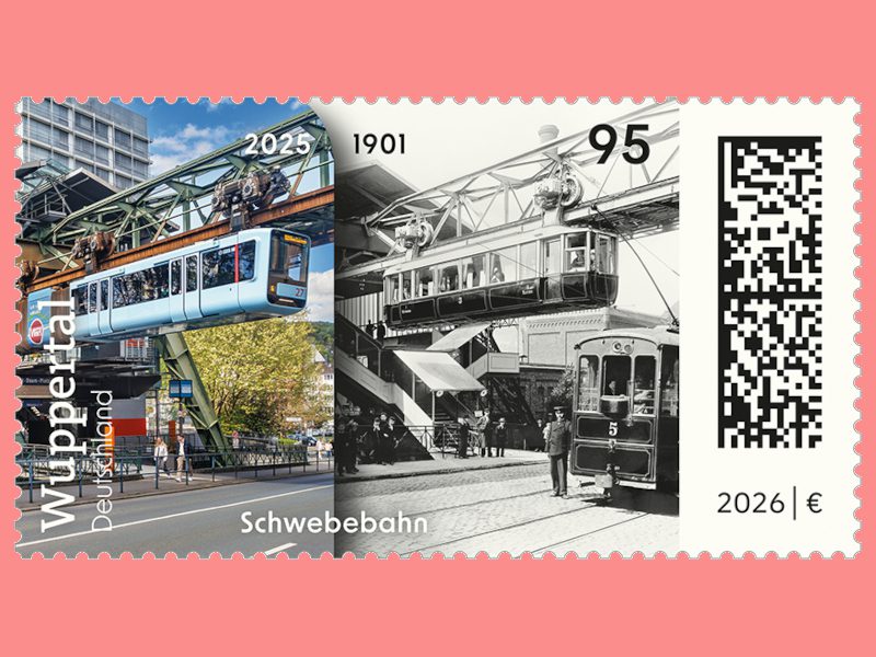 O quinto selo da série de selos postais especiais “Viagem no tempo pela Alemanha“, produzido pelo Deutsche Post, aborda um dos meios de transporte mais conhecidos do mundo: a Schwebebahn de Wuppertal. A ideia da que hoje é a monotrilho mais antiga ainda em operação e, ao mesmo tempo, a ferrovia suspensa mais antiga ainda em funcionamento no mundo foi desenvolvida no fim do século XIX pelo empresário e engenheiro Eugen Langen (1833–1895), quando particularidades topográficas e as crescentes exigências do transporte de passageiros e de cargas tornaram necessário um meio de transporte de massa que fosse ao mesmo tempo moderno e economizador de espaço.