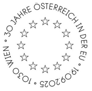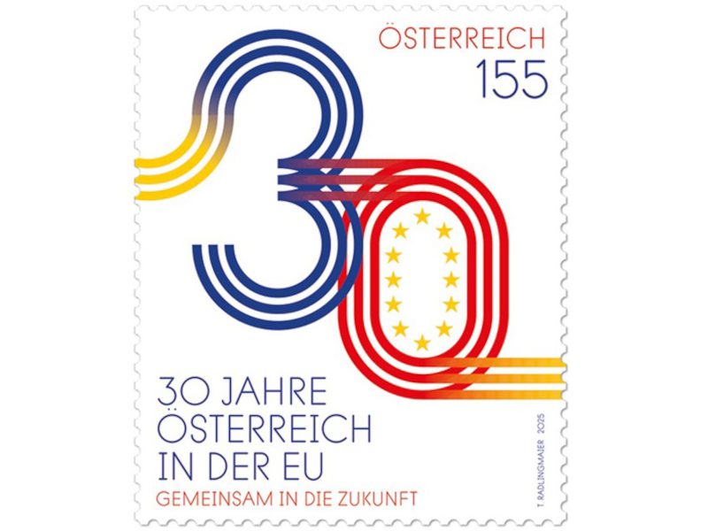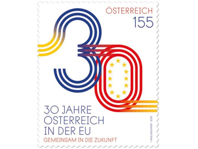 A Österreichische Post assinalou três décadas de participação austríaca na União Europeia com a emissão de um selo comemorativo concebido por Theresa Radlingmaier.