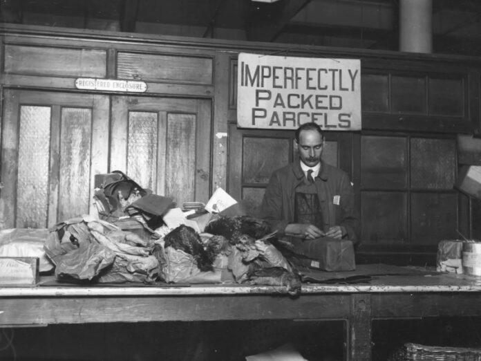 Na imagem destacada, que nos remete ao ano 1926, podemos ver um colaborador postal da USPS lidando com encomendas muito mal embaladas para serem entregues pelos métodos usais (normais). Na placa podemos ler “Imperfectly Packed Parcels”, numa tradução livre “Encomendas Embaladas de forma Imperfeita”. Além desta mensagem na parede o precário volume em cima do balcão, indiscutivelmente, reforça esta conclusão.