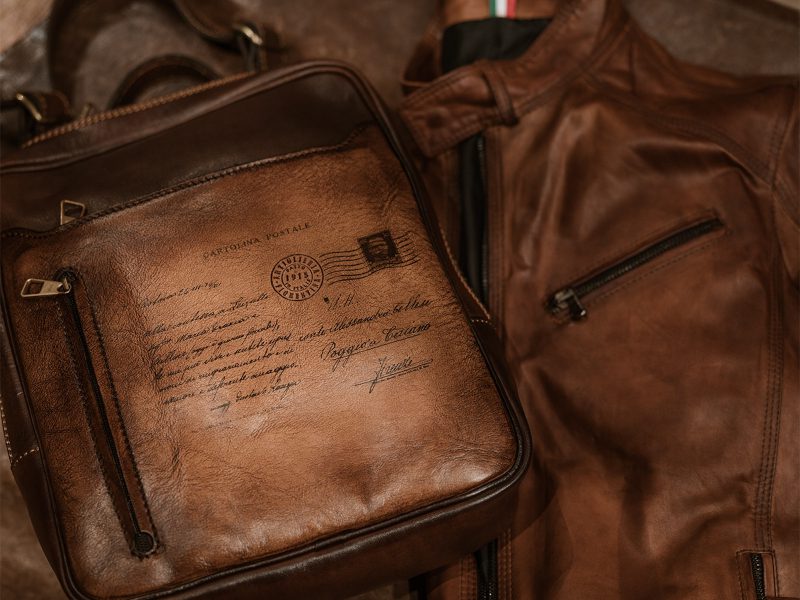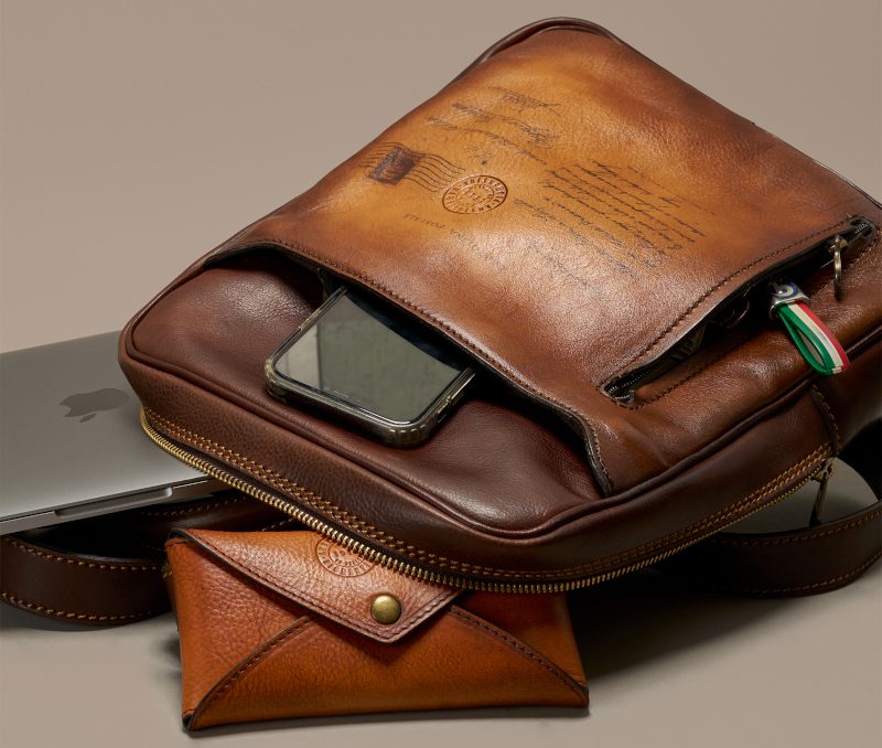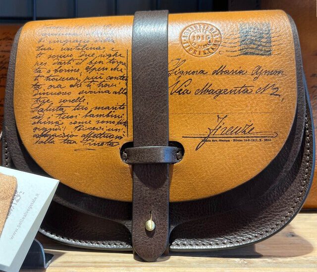 No processo de fabricação, a integração dos selos e carimbos autênticos ao couro foi feita com primor artesanal. As imagens das correspondências foram transferidas e impressas diretamente no couro utilizando técnicas modernas de impressão de alta definição, garantindo que cada detalhe – do tom das obliterações postais ao relevo das letras manuscritas – ficasse nítido e permanente. Em alguns casos, texturas em relevo sutis acompanham a estampa, ressaltando os contornos do selo ou o carimbo, quase como se o acessório tivesse sido ele próprio selado e carimbado décadas atrás. O couro utilizado é de alta qualidade (origem toscana, conforme o padrão da marca) e serve de “tela” robusta para essas estampas retro. O resultado são peças em que se pode tocar a história postal: a vista e o tato remetem às cartas antigas, porém protegidas por um acabamento que assegura durabilidade no uso diário. É moda, mas também é preservação – os selos não estão apenas colados; estão incorporados ao design de forma indelével, imortalizando-os.
