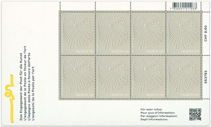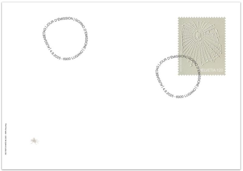 Com valor facial de 1,20 francos suíços, a peça apresenta a teia de aranha como motivo doméstico, indomável, subversivo e frágil, associada a redes, tramas finas e formas vegetais, numa leitura que “dá presença ao invisível“. Do ponto de vista técnico, a imagem é uma impronta a seco (relevo seco) sobre papel de linho produzido pela cartiera artesanal Lafranca, no Vale Maggia, com suporte técnico da Complice press, de Lugano. O selo, por sua vez, foi impresso em relevo sobre papel reciclado, solução coerente com o compromisso de sustentabilidade.