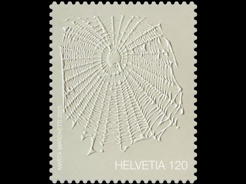 Com valor facial de 1,20 francos suíços, a peça apresenta a teia de aranha como motivo doméstico, indomável, subversivo e frágil, associada a redes, tramas finas e formas vegetais, numa leitura que “dá presença ao invisível“. Do ponto de vista técnico, a imagem é uma impronta a seco (relevo seco) sobre papel de linho produzido pela cartiera artesanal Lafranca, no Vale Maggia, com suporte técnico da Complice press, de Lugano. O selo, por sua vez, foi impresso em relevo sobre papel reciclado, solução coerente com o compromisso de sustentabilidade.